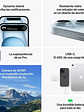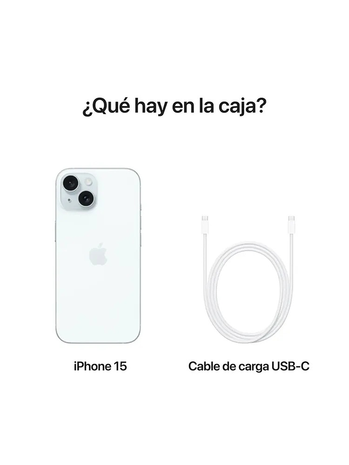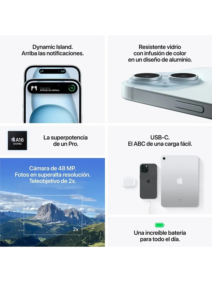 El iPhone 15 conserva el diseño de la generación anterior pero incorpora el Dynamic Island a su pantalla de 6.1 pulgadas. Potenciado por un procesador Apple A16 Bionic, el iPhone 15 cuenta con una cámara dual de 48MP + 12MP, y su cámara selfie es de 12 MP, sumando sensores para reconocimiento facial Face ID. El iPhone 15 admite carga inalámbrica para su batería que carga a la mitad en 30 minutos, cuenta con parlantes stereo, resistencia al agua, y corre iOS 17.